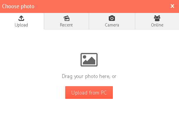(அல்லது அதிலுள்ள ஏதேனும் ஒரு ஆப்சனை பயன்படுத்தி போட்டோவினை அப்லோட் செய்யலாம். உங்களுடைய கம்ப்யூட்டரில் கேமிரா இருந்தால் Camera option ஐ கிளிக் செய்து அதன் மூலம் போட்டோ எடுத்து அப்லோட் செய்யலாம். பேஸ்புக், கூகிள் டிரைவ், ட்விட்டர் போன்றவற்றில் உங்களைய புகைப்படம் ஆன்லைனில் இருந்தால் Online ஆப்சன் தேர்ந்தெடுத்து அதன் மூலம் புகைப்படத்தை அப்லோட் செய்திடலாம். )