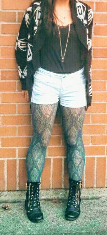 I chose to complement my black combat boots with gold detailing by wearing a pair of plain white shorts with blue patterned fishnets. I like to be pretty simple with my outfits, so I wore a plain black top and a printed black knit cardigan as well. I also added a simple long silver necklace with a small pendant. This way, the focus was on my tights and shoes.