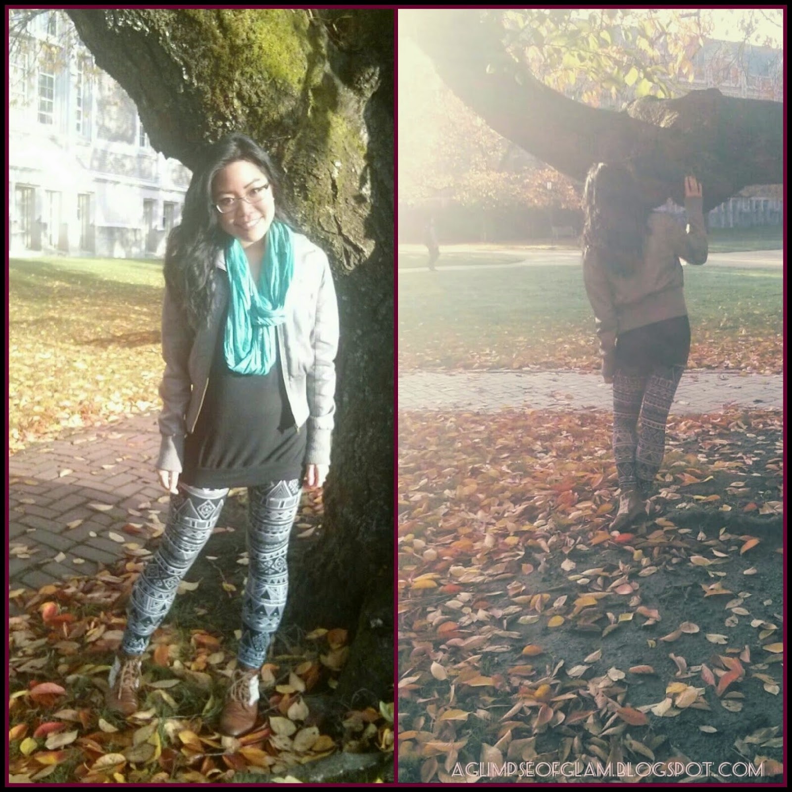 Today, I wanted to share with you one of my favorite outfits. I pulled on a pair of black and white printed leggings and wore a black top with it. The top actually has these lace-detailed shoulders, but it was cold so sorry just use your imagination.