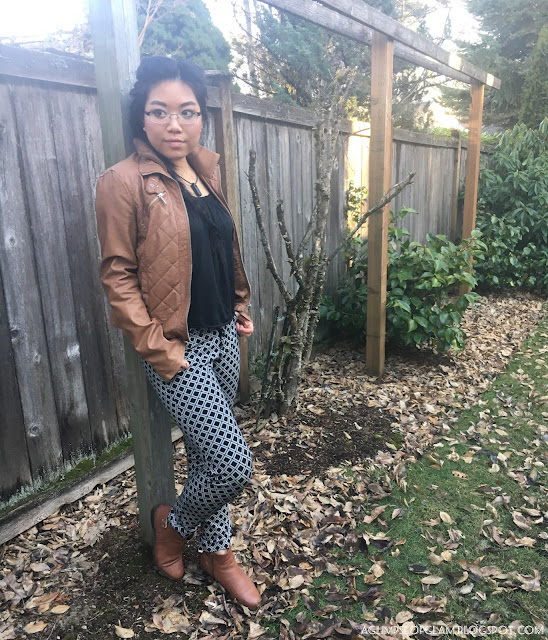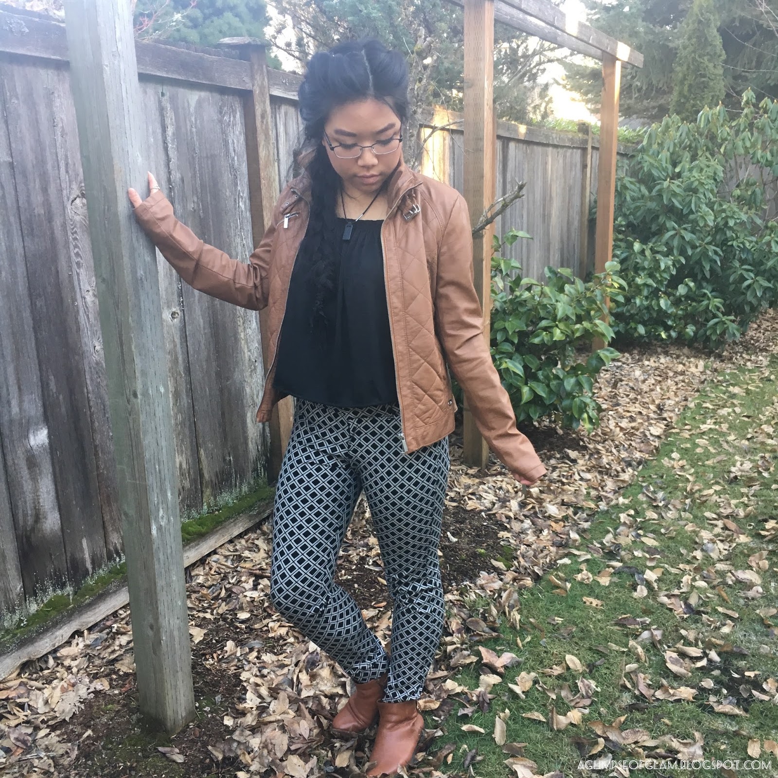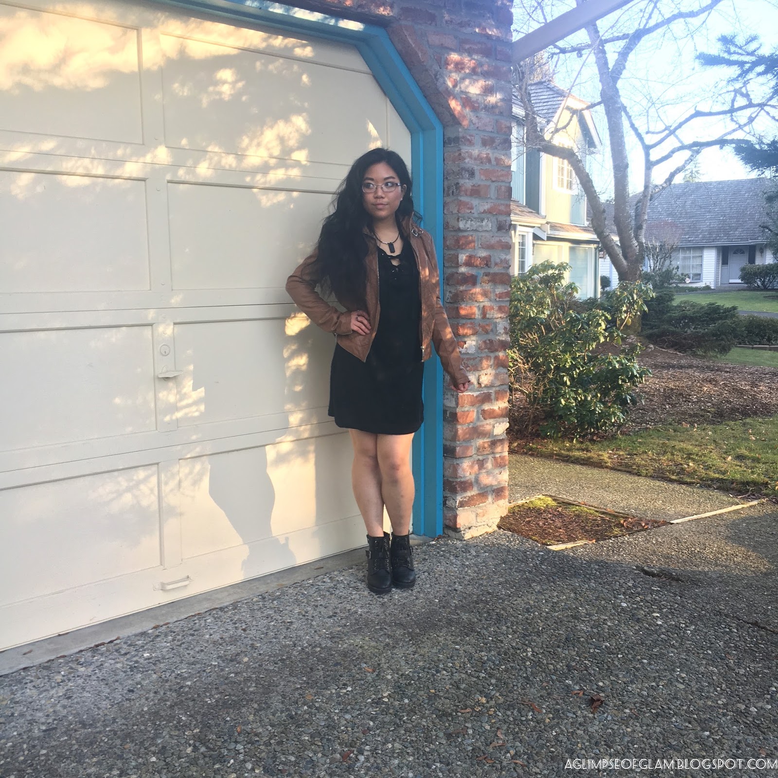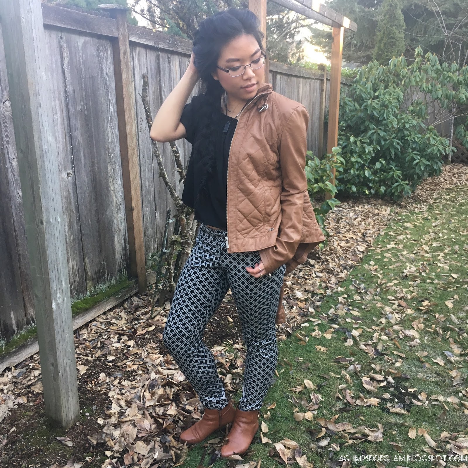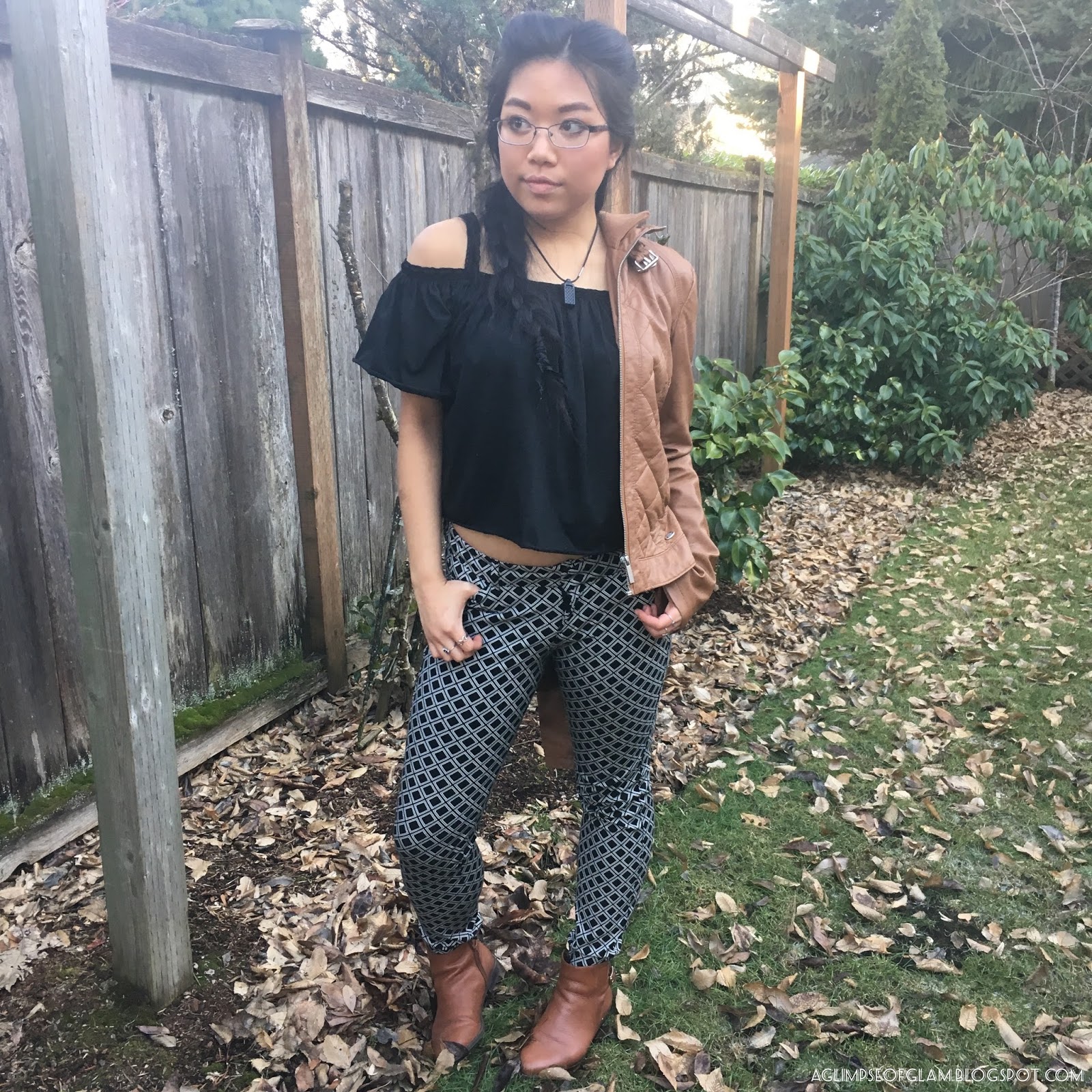 I wore a brown jacket to break up the monochrome look. I’m sure you’ve all seen this jacket plenty of times before already in previous posts. Plus, the high collar of the jacket is really what appealed most to me. The contrast between that higher collar and the low off-the shoulder top works well because the top under the jacket looks mostly like it has a straight across neckline.