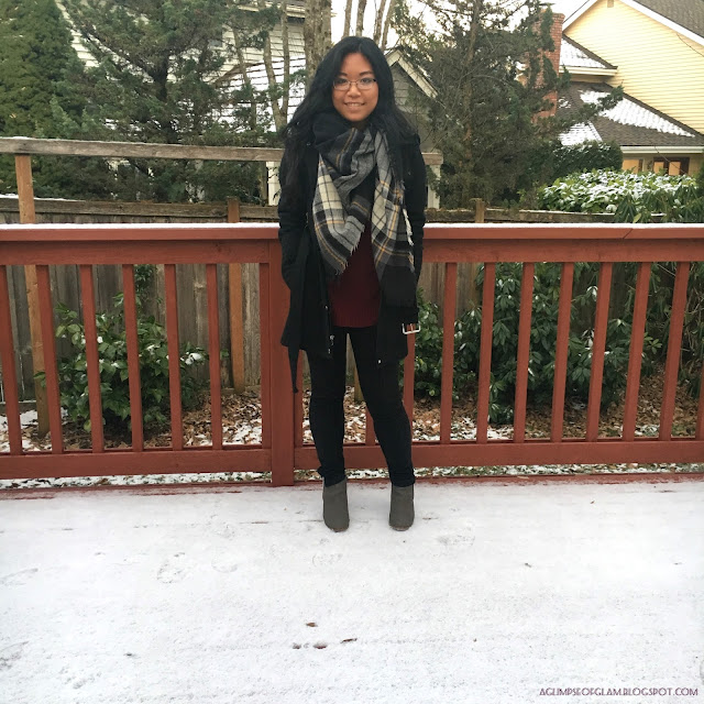 I love throwing it on over a simple top as an easy way to add pattern and variety to my look. Here, I had on this burgundy-hued long sleeve paired with black pants and grey heeled ankle boots. By adding the blanket scarf, it quickly accessorized it into something that looks less lazy and quickly thrown together. Plus, it really helped me keep warm that snowy day.
